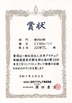 東京CW 2024 都内電信の部 3.5MHz 3位